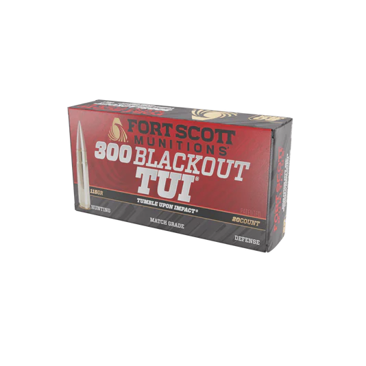 Designed for versatility, the 300 Blackout excels in hunting, match shooting, and self-defense. The TUI® technology enables the bullet to tumble end-over-end upon impact with water-based tissue, creating a more effective and destructive wound channel. With consistent quality and performance, trust Fort Scott Munitions® for reliable results every time you pull the trigger.