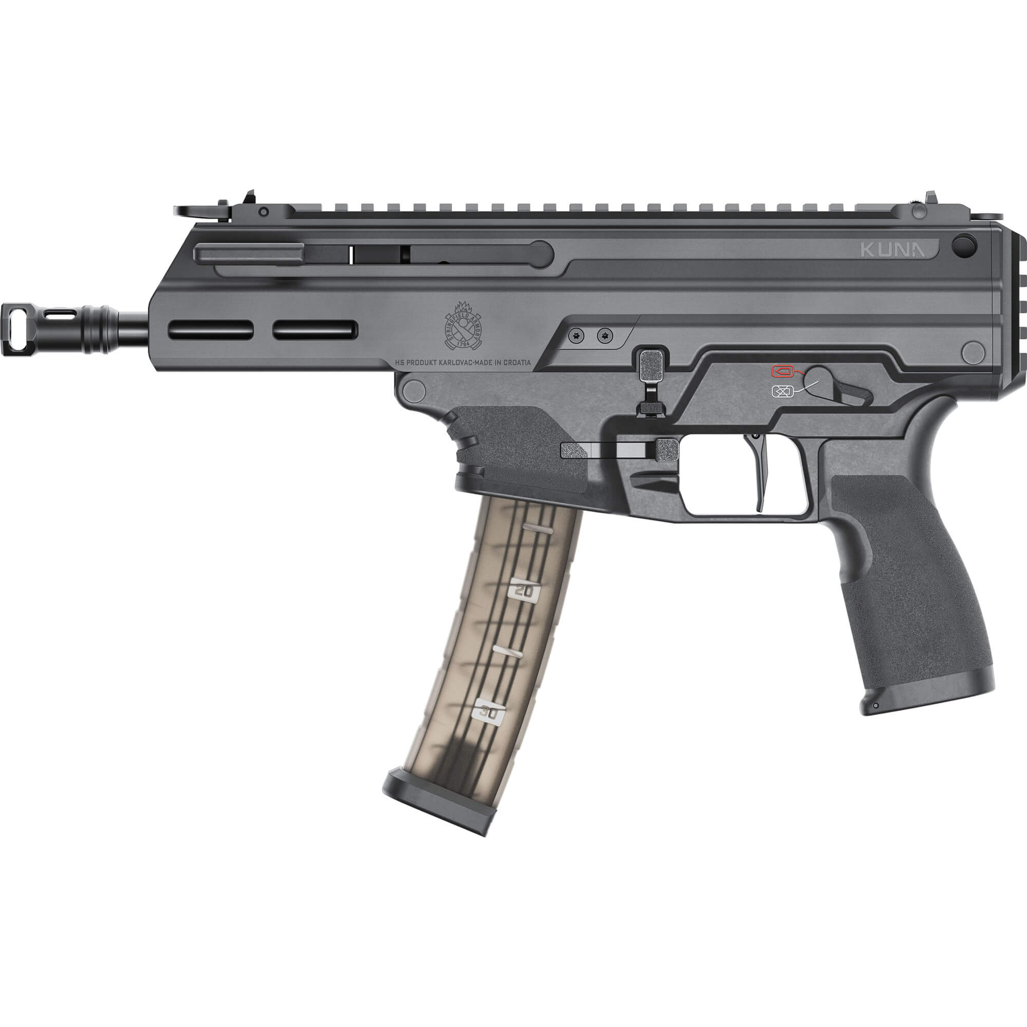 Designed to deliver exceptional shooting stability in a portable package, the Kuna houses a roller-delay operating system that dramatically reduces felt recoil and enhances control. Chambered in 9mm, it features a 6″ threaded barrel with a muzzle brake, hybrid flip-up sights, and a 30-round translucent magazine with metal feed lips for reliable operation. Fully ambidextrous controls ensure seamless engagement for any shooter, while the non-reciprocating charging handle keeps handling smooth and unobstructed. The integrated Picatinny rail end plate allows easy attachment of stabilizing braces for added support.